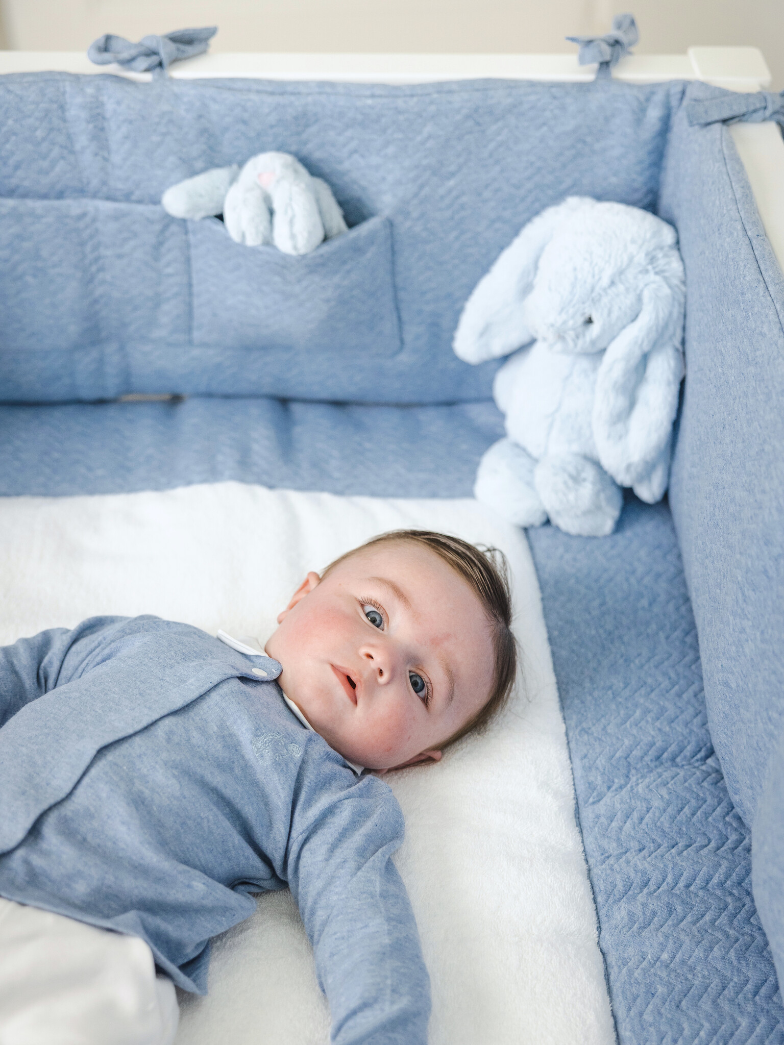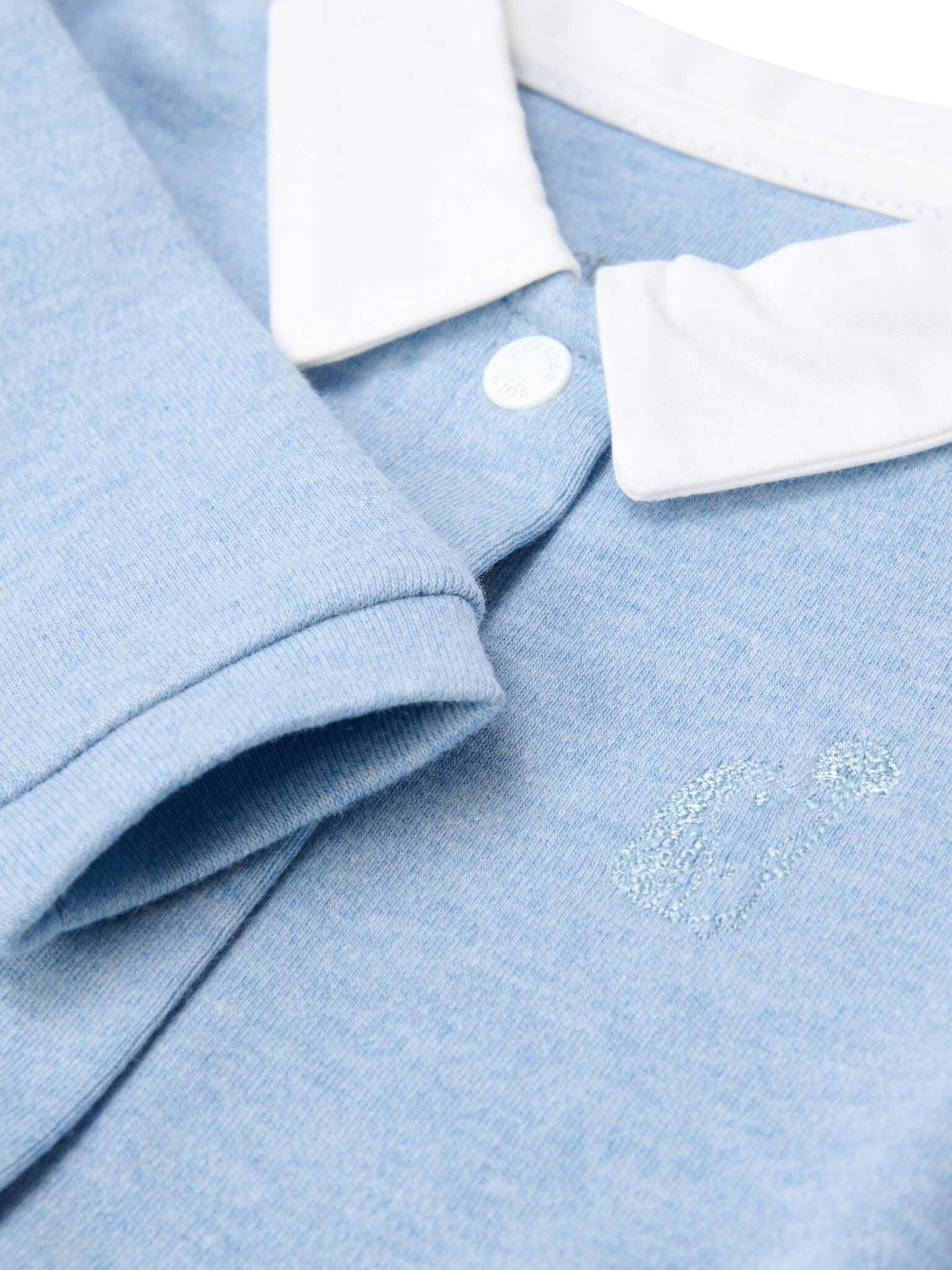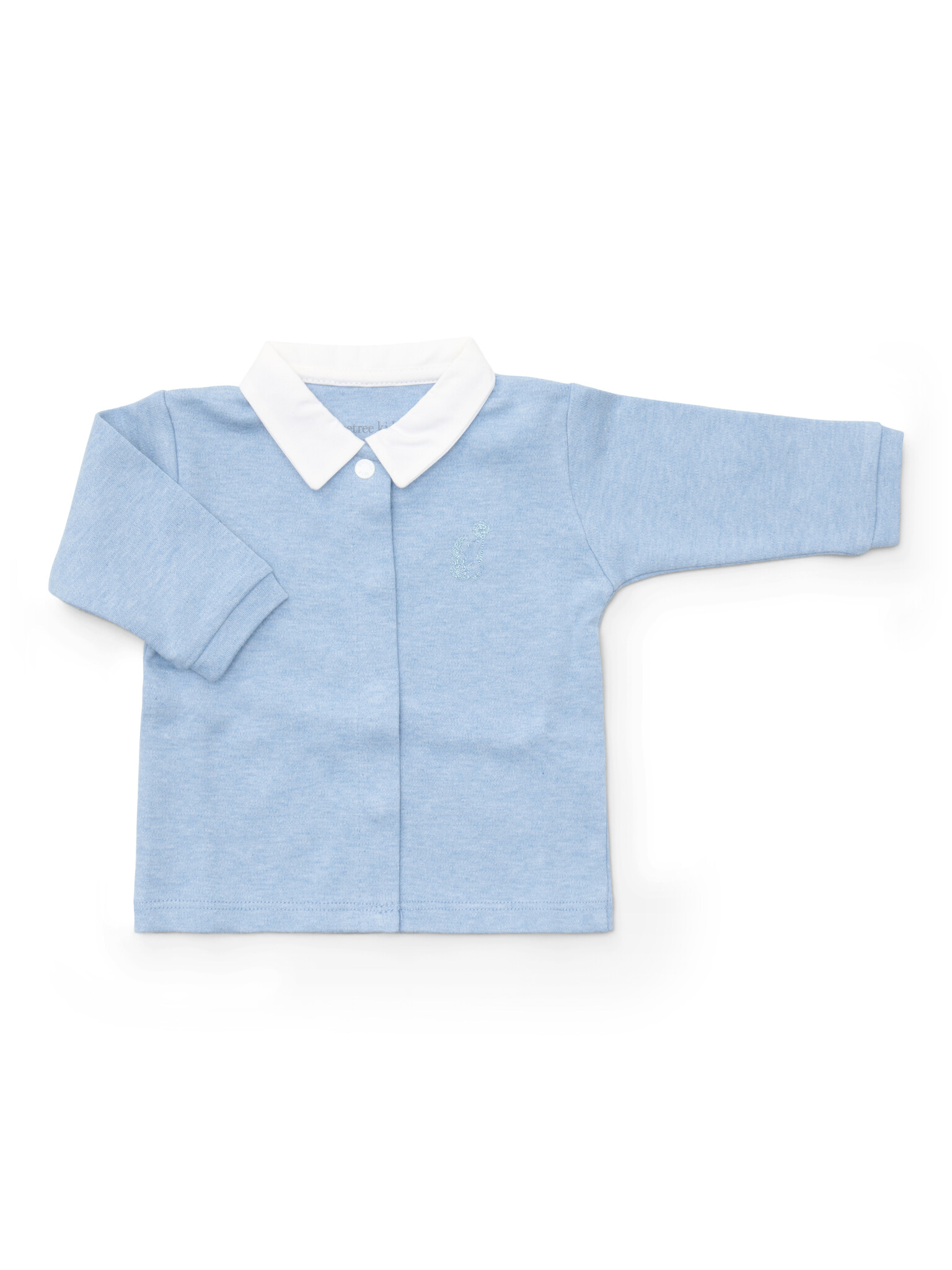 This beautiful set is made of super soft cotton and contains a denim blue shirt combined with white pants.