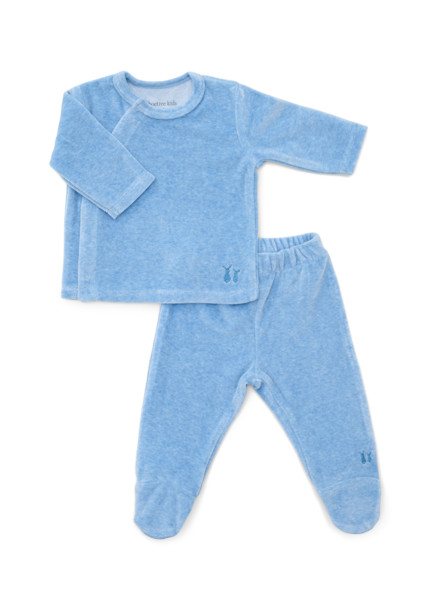 This beautiful set is made of super soft velours cotton mix. The top has an easy snap button closure at the front and the pant an elastic waistband. Also super nice to combine with our rompers.