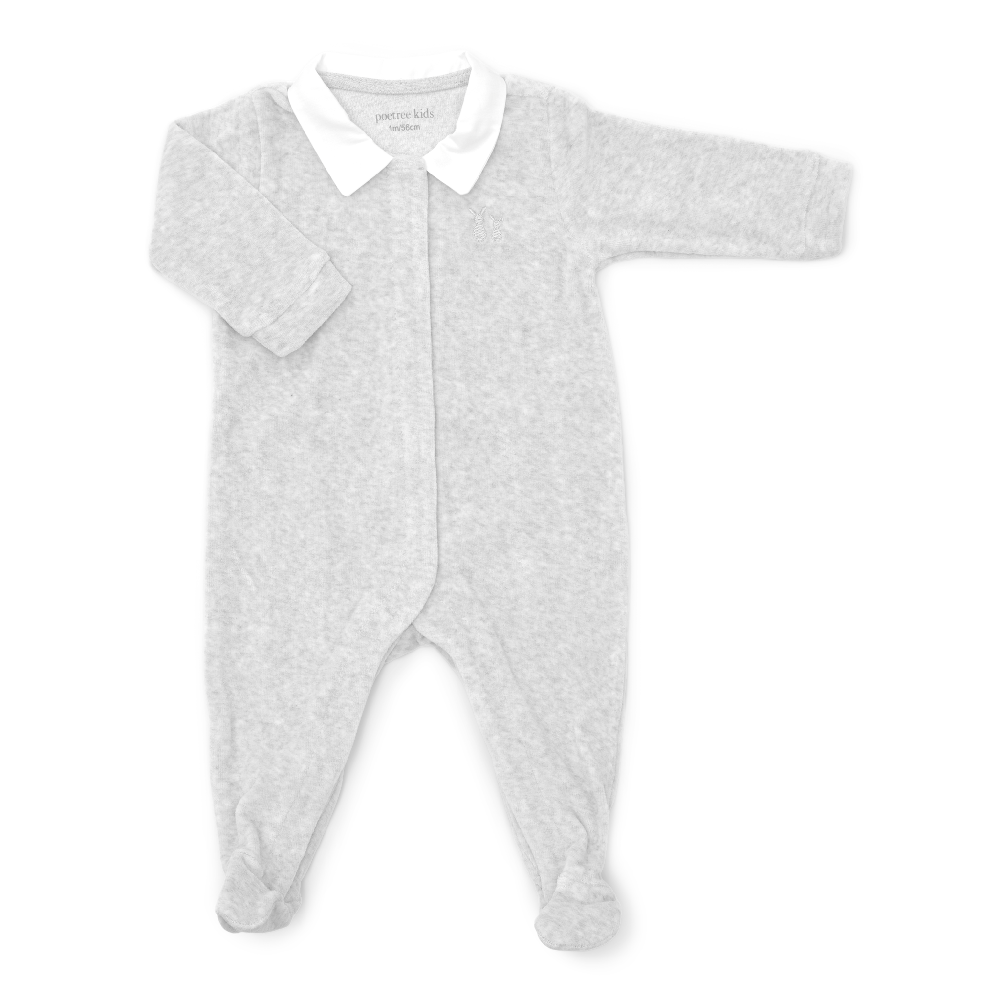 This baby suit is made of super soft velvet and has a beautiful poplin collar and cuffs.