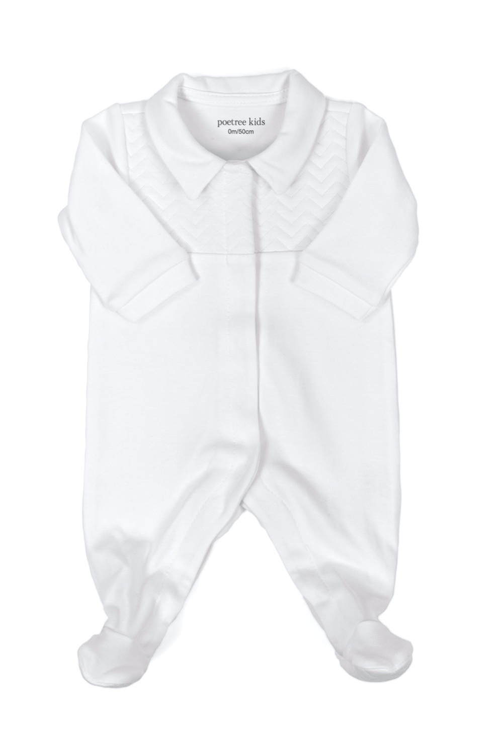 Dit babypakje gemaakt van zacht jersey heeft aan de voorzijde van het pakje en onderaan de voetjes een zig-zag patroon.
